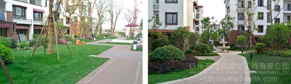楊經(jīng)理說:“紫荊東郡的植物配置以統(tǒng)一中富于變化為原則,上層苗木主要選擇大規(guī)格的香樟、無患子和馬褂木等,中下層則以桂花、雞爪槭、紅葉石楠球、金森女貞球等常見的球類灌木及地被苗進(jìn)行組團(tuán),苗木的種類雖然不是很豐富,但在配置上卻形式多樣,特別是通過在施工時(shí)對(duì)設(shè)計(jì)的再深化,要求在植物種植時(shí),樹形、色彩、線條、質(zhì)地及比例都要有一定的差異和變化,顯示多樣性,但相互之間又有一定的相似性,從而使得整體的植物配置在和諧統(tǒng)一中顯得生動(dòng)活潑,簡(jiǎn)單而不單調(diào),統(tǒng)一而不呆板,營(yíng)造出一種寧?kù)o、閑適的氛圍?!?/p>