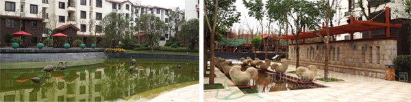 在紫荊東郡小區(qū),水景隨處可見,從主入口兩側(cè)近50米的景觀橋水景,到入口正前方一個(gè)大型的石雕噴泉,再到小區(qū)里面幾條主干道交匯的十字路口的小型地面噴泉,中心水景上的圓形石雕噴泉,特別是不遠(yuǎn)處的動(dòng)物噴泉雕塑,只只鶴低頭凝思,細(xì)長(zhǎng)的水流從鼻端的出水口處流出,落入下方的水池里,更是格外引人注目?!斑@些水景小品具有的藝術(shù)特性與審美效果,加強(qiáng)了整個(gè)景觀環(huán)境的藝術(shù)氛圍,成為讓空間環(huán)境生動(dòng)起來的關(guān)鍵因素,在提高小區(qū)藝術(shù)品質(zhì)和景觀形象的同時(shí),更給人們帶來美的享受?!睏罱?jīng)理如是說。