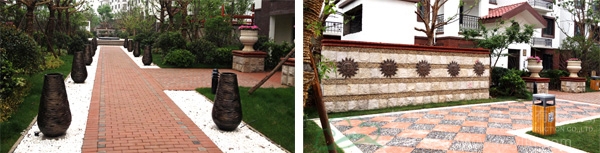 據(jù)楊經(jīng)理介紹,紫金東郡小區(qū)里的鋪裝材料主要以橙紅色的燒結(jié)磚和仿古磚為主,燒結(jié)磚具有承重量大和隔聲性強(qiáng)的特點(diǎn),是小區(qū)園路鋪裝的優(yōu)良選擇,此外,紅色又與建筑的整體色調(diào)相搭配,有種渾然一體的效果感;而仿古磚除了具有防水、防滑、耐磨等特性外,還具有獨(dú)特的古典韻味,更能營(yíng)造出歲月的滄桑和厚重感。在鋪裝方式上,有的是道路中間用橙紅色的燒結(jié)磚,兩邊鋪設(shè)白色的石子,營(yíng)造一種居家庭院的溫馨感;有的是正方形的仿古磚與黑色的石子,一紅一黑,相映成趣;還有的用白色的仿古磚作道路兩側(cè)的點(diǎn)綴,風(fēng)格自成一體。純美的色彩、流暢的線條、些微的暖調(diào),不同的道路上別具特色的圖案,使人走上去踏實(shí)、安穩(wěn)而又感古樸、雅致,成為不斷蜿蜒的腳下風(fēng)景。