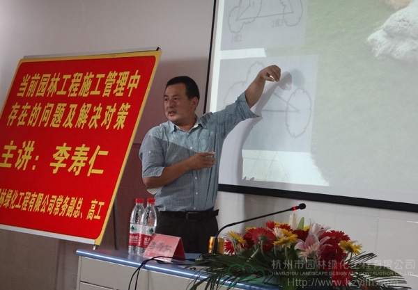 7月4日,應(yīng)寧波城市職業(yè)技術(shù)學院邀請,杭州市園林綠化工程有限公司常務(wù)副總李壽仁在該校舉辦的“第三期園林企業(yè)經(jīng)營管理人才高級研修班”上作“當前園林工程施工管理中存在的問題與解決對策”專題講座,到場聽課的有來自寧波地區(qū)的園林企業(yè)高管、項目經(jīng)理以及在校師生。