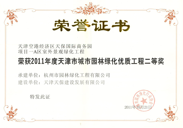 公司一工程榮獲“2011年度天津市城市園林綠化優(yōu)質(zhì)工程二等獎(jiǎng)”