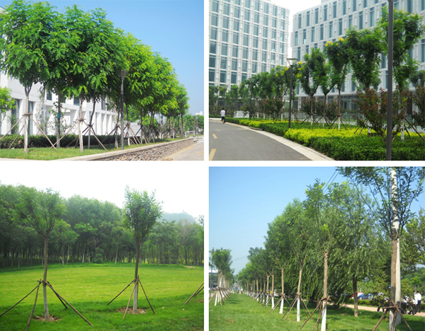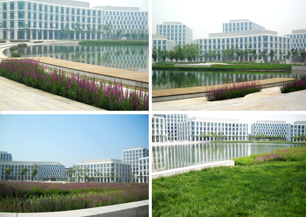 本工程是大型商務(wù)園配套景觀綠化工程,整個(gè)項(xiàng)目以人工湖為中心將建筑呈環(huán)形布置,分為內(nèi)環(huán)、中環(huán)、外環(huán)。綠化圍繞建筑均勻有層次的分布,環(huán)路兩側(cè)栽植國(guó)槐;辦公樓之間則種植日本晚櫻、碧桃、海棠等觀花、觀葉類喬木,以及黃楊、女貞等灌木和綠籬;中心湖區(qū)域兩側(cè)的能源半島和濕地半島上被喜水性植物覆蓋,起到凈化湖水的作用,岸邊種植垂柳,開(kāi)辟休閑區(qū)域;園路鋪裝材料選用水洗石、花崗巖,石汀、鋪裝與綠地自然銜接;再加上花壇和景觀小品,各種觀賞性植物互相襯托,喬木與灌木合理搭配,使得景觀與建筑、環(huán)境完美結(jié)合。