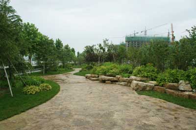 為了配合每個(gè)景觀節(jié)點(diǎn)的風(fēng)格,園路的鋪裝材料和手法各不相同。據(jù)高經(jīng)理介紹,工程中用到的鋪裝材料主要有汀布石、印花地坪、文化石、青磚、荷蘭磚、花崗巖等,其中,印花地坪是一種新型的鋪裝材料。“印花地坪主要用在北廣場(chǎng)上,其工藝為:在混凝土上面灑上特殊的配料,整平之后,再用模具一塊一塊壓出形狀,最后用特殊的膠水封膜,這種施工方法工藝新穎,花樣和顏色比較多,雖然工藝較為復(fù)雜,但是景觀效果非常好,遠(yuǎn)遠(yuǎn)看去,就如盛開在腳下的‘花?!?,一路迤邐而去?!备呓?jīng)理說,“其他的鋪裝材料雖然比較常見,但我們?cè)阡佈b工藝上進(jìn)行了創(chuàng)新,如在下沉廣場(chǎng)的廊架旁,我們用黑色的鵝卵石與芝麻灰的花崗巖搭配,鋪出來的路面呈現(xiàn)出立體感,這種鋪裝工藝是借鑒了室內(nèi)裝飾的手法,通過改造,用于室外鋪裝,遠(yuǎn)遠(yuǎn)看去,就像一級(jí)一級(jí)的臺(tái)階,帶動(dòng)了周圍的景觀也動(dòng)起來。”