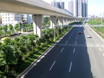 如今,開車行進(jìn)在這條道路上,干凈整潔的路面、開闊通透的視野、清新自然的景觀,給人帶來(lái)閑適、愜意的感覺?!耙匀藶楸荆鹬刈匀弧钡木G化理念,體現(xiàn)在景觀中的每個(gè)細(xì)節(jié);自然環(huán)境與城市環(huán)境的密切結(jié)合,使高架橋的道路通行功能與橋下中央綠化帶的生態(tài)功能有機(jī)融合。整條道路,不僅體顯出深圳這個(gè)濱海大都市獨(dú)有的景觀特色,更彰顯出這個(gè)城市的生機(jī)活力與熱情奔放。