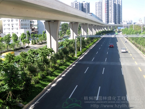 該工程最大的特色和亮點(diǎn)為:“以人為本,尊重自然”、“ 處處有綠葉,無(wú)處不飛花”等自然生態(tài)的設(shè)計(jì)理念貫穿始終;中央綠化帶位于高架橋下,長(zhǎng)勢(shì)茂盛的各類植物形成一條繽紛絢麗的彩帶擁簇著高架橋段,使整條橋段與綠化景觀有機(jī)融合。2012年,該工程榮獲中國(guó)風(fēng)景園林學(xué)會(huì)“優(yōu)秀園林綠化工程金獎(jiǎng)”。