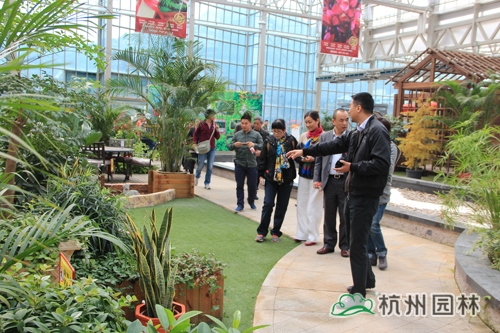 第二天,考察團(tuán)在杭州市園林綠化股份有限公司總裁張炎良、副總裁丁旭升的陪同下參觀了畫(huà)境·青山湖花園中心。該花園中心是一個(gè)集園藝產(chǎn)品研發(fā)、展示和推廣的現(xiàn)代園林高新技術(shù)平臺(tái),致力于打造庭院設(shè)計(jì)、咨詢(xún)、建造、養(yǎng)護(hù)等各類(lèi)功能綜合的一站式園藝服務(wù)中心。項(xiàng)目有近3000畝配套生產(chǎn)基地,12000平米研發(fā)與生產(chǎn)溫室,以及室內(nèi)情景展示區(qū)、園藝展示區(qū),室外陳列展示區(qū)、應(yīng)用展示區(qū)等多個(gè)功能區(qū)塊。其中,用于室內(nèi)園藝展示的4000平方米的展覽溫室,引進(jìn)荷蘭PRINS溫室技術(shù),實(shí)現(xiàn)對(duì)溫度、光照等全智能控制,是一個(gè)技術(shù)含量極高的節(jié)能、環(huán)保型現(xiàn)代溫室。