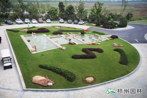 2號樓大廳門前,在大面積的草坪上,選用紅花檵木、金邊胡頹子、茶梅等一些小毛球,用中國書法的用筆法則,十分簡潔地“書寫”出點、橫、豎、鉤、提、撇、短、捺,即代表中國書法中筆畫大體的“永”字八法,傳達出“大道至簡”的書法精髓。這種匠心獨運的植物配置,將園林的造景手法與中國書法藝術(shù)完美配合,景觀效果令人耳目一新,使項目的整體景觀品位得到了質(zhì)的提升,是中國傳統(tǒng)園林造景手法的典型運用。