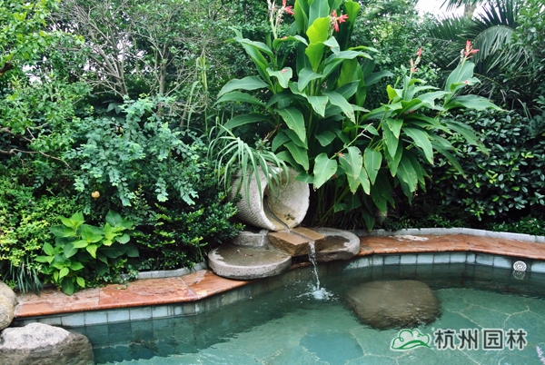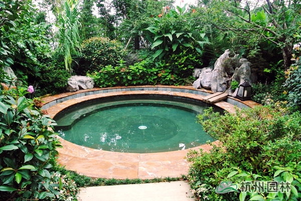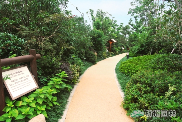 五千年的中國歷史文化,恢宏浩瀚,為園林造景提供了取之不竭的素材;園林景觀,也因為傳承了深厚的文化底蘊而散發(fā)出獨特的藝術(shù)魅力。作為一個旅游度假項目,對園林景觀的要求,不僅僅只是精致大氣、風(fēng)韻天成的美景,更需要有深厚的文化底蘊,彰顯獨一無二的中國元素。為此,在2號樓大廳門前,用植物造景再現(xiàn)代表中國書法中筆畫大體的“永”字八法,彰顯中國書法的魅力;在泡池的建造上,運用老石碾、壓門石、老磨盤等老石材,打造出懷舊氣息濃郁的鄉(xiāng)土風(fēng)情。