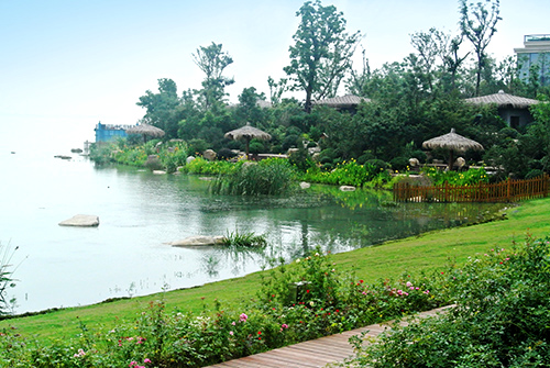 該項目將“以人為本,尊重自然”貫穿于設計到施工的各個環(huán)節(jié),為了最大限度地保護太湖水域環(huán)境,各個施工環(huán)節(jié)中,因地制宜,因材施用,在駁岸處理中,通過草坪入水、水生植物種植、景石運用等方法,在充分保護原有湖岸的基礎上,加強對湖水水質(zhì)的凈化,營造出生態(tài)、自然的湖岸景觀,成為項目中的一景。此外,種植的植物,大量選用當?shù)剜l(xiāng)土樹種,既營造出濃郁的景觀特色,又有利于提高植物的成活率,減少后期的養(yǎng)護費用,有效節(jié)約了工程成本。
