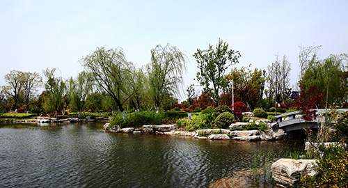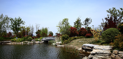 其中,人工湖面積7000平方米,小而精致,可謂是整個(gè)公園的“點(diǎn)睛之筆”。由親水平臺區(qū),源頭區(qū),中心湖面區(qū),鄰水生態(tài)區(qū),橋梁區(qū)構(gòu)成。湖面區(qū)域貫穿整個(gè)工程,沒有自然條件的襯托,完全由人工園林造景手法完成,在鄰水景觀帶種植睡蓮、荷花、再力花、千屈菜、鳶尾、蘆葦?shù)人参铮瑺I造生態(tài)岸線,同時(shí)選擇其他親水植物,如美人蕉、碧桃、楊柳、水杉作為過渡和背景,虛實(shí)結(jié)合,營造出多方位的景觀效果。湖面雖小,但結(jié)構(gòu)完整,假山疊水,拱橋,原石臨水橋,湖邊卵石生態(tài)群落一應(yīng)俱全。其中,景石主要使用了安徽的靈璧景石,約7000噸,堆疊出水源、暗橋、親水沿岸等景觀。