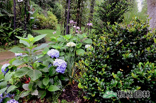 花園入口景觀:藍(lán)色的‘無盡夏’在翠竹及礬根的襯托下成功吸睛。