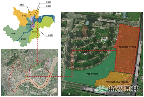 江干區(qū)東湖路市民公園位于東湖路與九喬街西南角,毗鄰九月庭院和泊林印象小區(qū),是江干區(qū)“一帶生態(tài)功能區(qū)”的“運(yùn)河—錢塘江—東湖路”U型生態(tài)軸的重要節(jié)點(diǎn)。結(jié)合已建成公園和高架互通施工預(yù)留地,對(duì)東湖路市民公園進(jìn)行統(tǒng)一規(guī)劃。