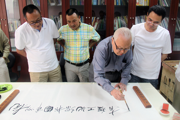 孫老不僅是一位園林規(guī)劃設(shè)計(jì)專家,同時(shí)也是一位書(shū)畫(huà)名家,他曾師從徐悲鴻、孫多慈教授學(xué)畫(huà),具有很高的藝術(shù)修養(yǎng)。在我們的邀請(qǐng)下,孫老欣然提筆,寫(xiě)下了“杭州市園林綠化工程有限公司”、“易大景觀”等公司名稱,以及“天然圖畫(huà)”、“造化為師”等題詞,以精準(zhǔn)的語(yǔ)言凝煉了他對(duì)園林行業(yè)的看法,寥寥數(shù)語(yǔ)中,讓我們深受啟發(fā)。行云流水的筆法、流暢飽滿的線條,每一幅題字都一氣呵成,每一幅題字都是一幅藝術(shù)畫(huà)。每幅題字寫(xiě)完,大家都會(huì)報(bào)以熱烈的掌聲,孫老對(duì)園林的深刻見(jiàn)解及深厚的書(shū)法功底令我們深深折服。
