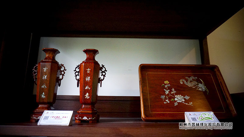 在浙江園的富春山居內(nèi),泥金彩漆、骨木鑲嵌、金銀彩繡等非遺展品也一并展出。泥金彩漆是寧波傳統(tǒng)的“三金”工藝之一,現(xiàn)主要分布于寧波市及其周邊地區(qū)。而骨木鑲嵌則是在木器表面嵌入動物骨骼進(jìn)行裝飾,也是寧波的一門特色手工藝。金銀彩繡則是在真絲面料上用各色彩線繡制、金線和銀線盤繡而成的漢族民間手工藝品之一。這些非遺展品展現(xiàn)了寧波深厚的文化底蘊(yùn)與人文精神。