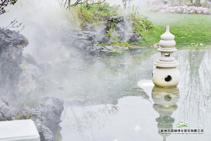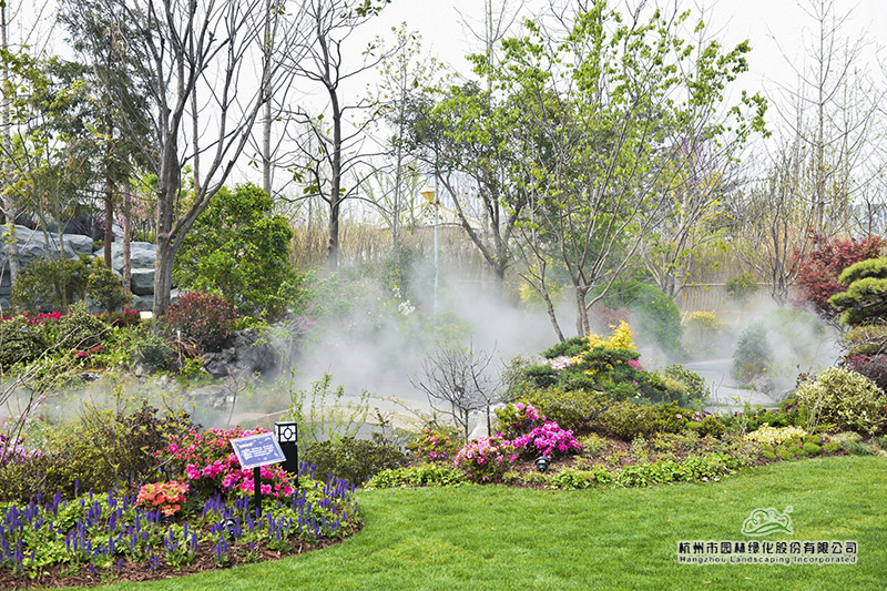 “延慶空氣干燥,而浙江園內(nèi)的植物,基本來(lái)自氣候溫潤(rùn)的南方,因此,如何有效保水和增加空氣濕度,以此來(lái)提高植物的成活率和保證后期生長(zhǎng),是我們施工時(shí)必須要考慮的問(wèn)題?!眳切〕烧f(shuō),“所以,園內(nèi)我們一共做了四套系統(tǒng),大樹根部的滴灌系統(tǒng)和樹上的噴灑系統(tǒng),大草坪的澆灌系統(tǒng),以及針對(duì)全園的霧森系統(tǒng)。”
