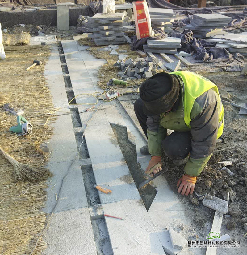 “白天溫度在零度以上時(shí),我們趁著太陽(yáng)出來(lái)、溫度比較高的時(shí)候施工;等太陽(yáng)快下山時(shí),溫度下降很快,這時(shí),我們就停止施工,用毛氈、草墊等將做好的鋪裝蓋起來(lái),再搭上保濕棚保溫。因?yàn)槿绻E胧┳霾坏轿唬滋熳龊玫匿佈b,晚上就會(huì)凍壞,導(dǎo)致白天的工作功虧一簣。一些種好的精品樹木,如造型黑松,我們就用很厚的棉被包裹起來(lái),以防凍傷?!被貞浧甬?dāng)初的施工過(guò)程,吳小成依然覺(jué)得這是施工中一段時(shí)常難熬的時(shí)期,“零下15℃的時(shí)候,我們還在施工,此時(shí)水已經(jīng)全部結(jié)冰,但施工又離不開(kāi)水,怎么辦呢?我們買了一個(gè)加熱器,把冰放到桶里,再把桶加溫化水,以此來(lái)滿足施工中的用水需求。”
