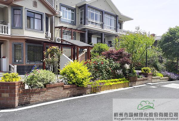 景墻邊的植物配置同樣有講究。利用銀杏、桂花、梅花、紅楓等植物營造上層空間,這些植物具有遮擋作用,能夠為庭院營造一定的私密空間。通過樹狀、球狀、攀援、傘狀、字母等各種形態(tài)的月季,金冠女貞球、龜甲冬青球、銀姬小蠟球、藍莓、八仙花、小葉梔子、翠蘆莉、花葉千鳥花、藍山鼠尾草、紫葉狼尾草等小喬灌木,在打造中層空間的同時,和美女櫻、金娃娃萱草、花葉玉蟬花、花葉香桃木、紫菀、澤蘭、礬根、五彩絡(luò)石、石竹等下層空間植物一起,裝飾和襯托景墻,使家家戶戶的景觀更加豐富多變。