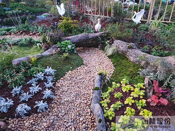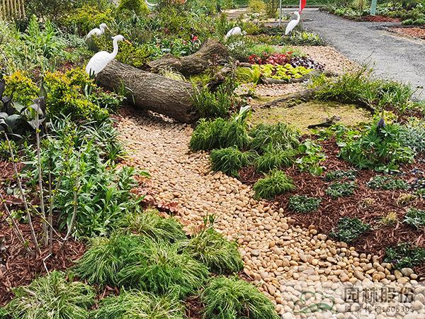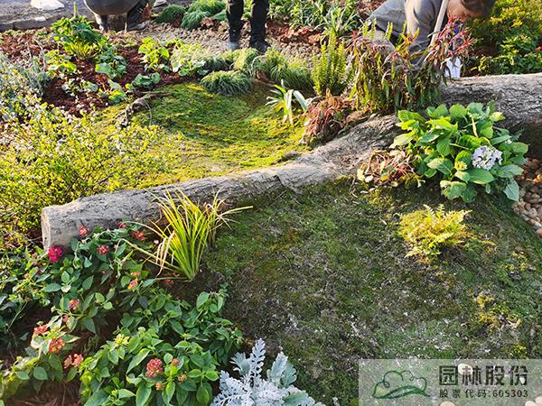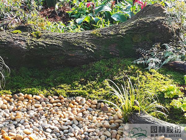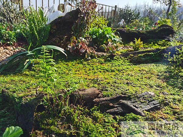 ①模擬苔蘚植物的生境條件,將蘚類(lèi)濕地景觀與枯木結(jié)合,在枯木與卵石道路交叉部位布設(shè)小水塘,保持苔蘚生長(zhǎng)環(huán)境土壤濕度。
