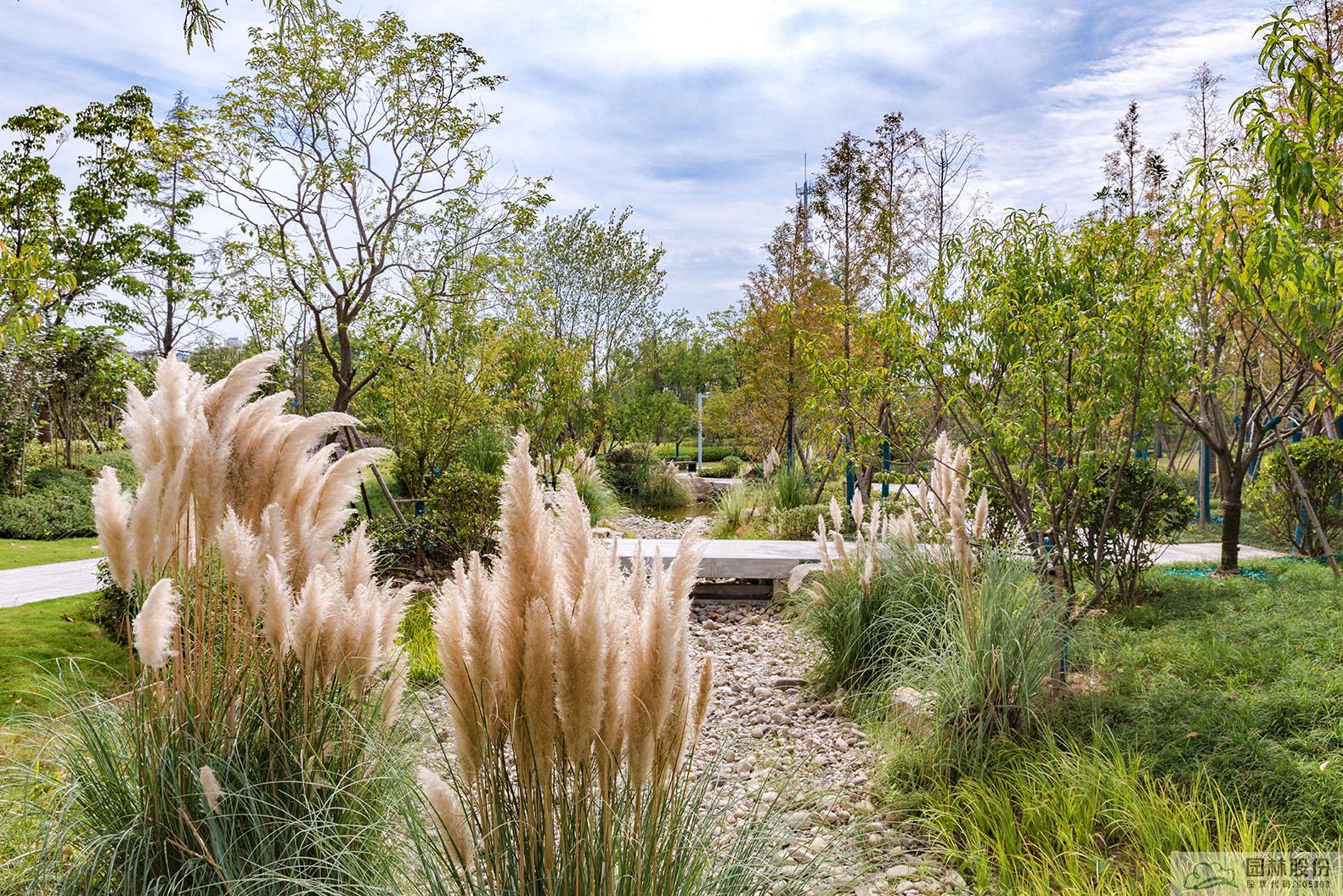 旱溪景觀同樣是海綿城市理念的應(yīng)用典范,下雨時(shí)蓄水,既可用于植物的日常澆灌,又能營造出清新靈動(dòng)的水景;干旱時(shí),鋪滿鵝卵石的水底又可與周邊豐富的植物營造出另一種園林意境。