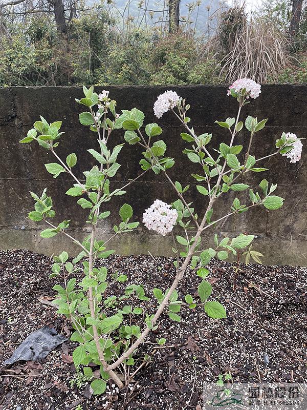 忍冬科莢蒾屬,落葉灌木,株高3-4.5 m,為瓊花和紅蕾莢蒾的雜交種。葉片較厚,較大,到秋季變成酒紅、橙紅或紫色色調(diào)。聚傘花序花蕾粉紅色,開放后白色,聚集似小雪球,具芳香,花徑8-14cm,花期3-4月。喜光,半陰環(huán)境也生長良好,生長速度中等;擇土不嚴,微酸性、中性至微堿性土壤均可生長,尤喜濕潤、排水良好的富含有機質(zhì)土壤;抗寒性強;耐修剪,適合自然風格的工程應用或庭院觀賞。