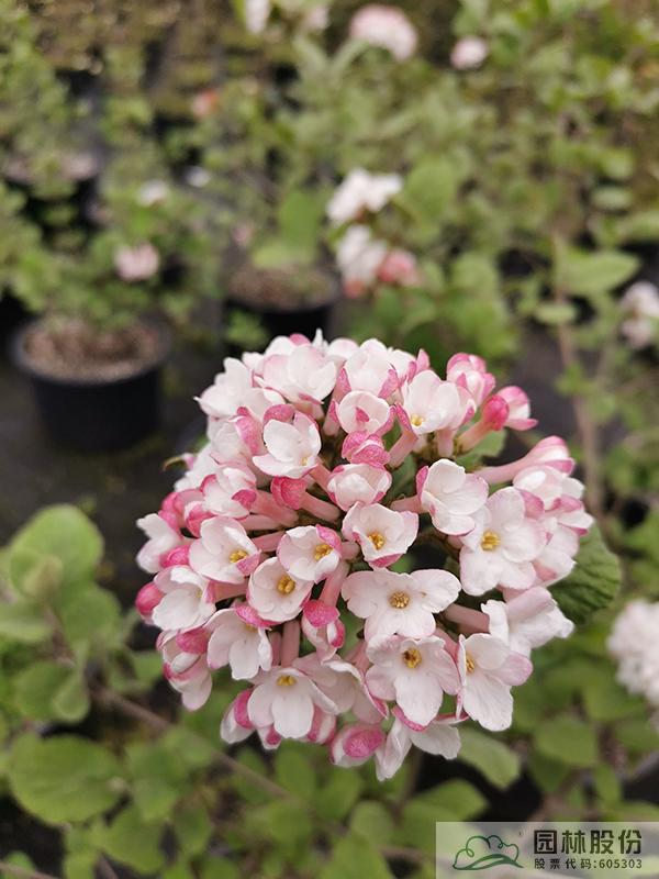 忍冬科莢蒾屬,半常綠或常綠灌木,株高2-3 m,為紅蕾莢蒾和煙管莢蒾的雜交種。葉色深綠,秋季轉(zhuǎn)紅,顏色程度因所處地區(qū)而異。該種繼承了紅蕾莢蒾粉花的優(yōu)良基因,花序未開放時呈現(xiàn)靚麗的粉色,開放后白色,且具有較濃郁的花香?;◤揭话?.5-10 cm,花期3-4月。植株具有良好的頂端優(yōu)勢,枝條年生長量大,但分枝能力稍弱。幾乎無病蟲害。適應性強,生長速度快,耐干旱且耐寒,適合自然風格的工程應用或庭院觀賞。