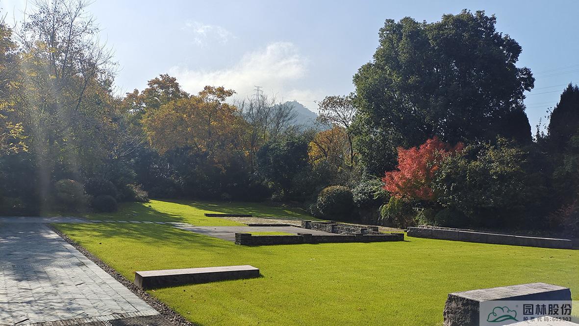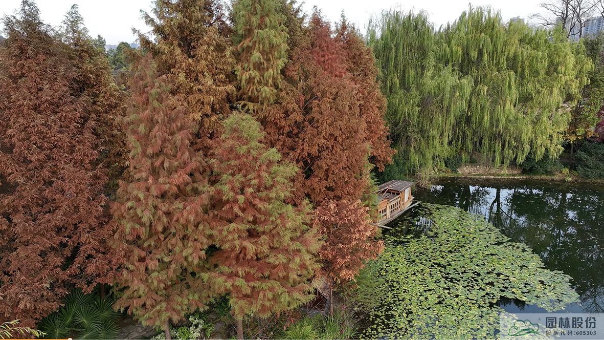 俯視畫境園南園,楓香林在陽(yáng)光中的色彩愈加斑駁,無患子綠色尚未全部褪去,金黃色樹冠愈加油亮,盡顯英式風(fēng)景林的自然、灑脫。