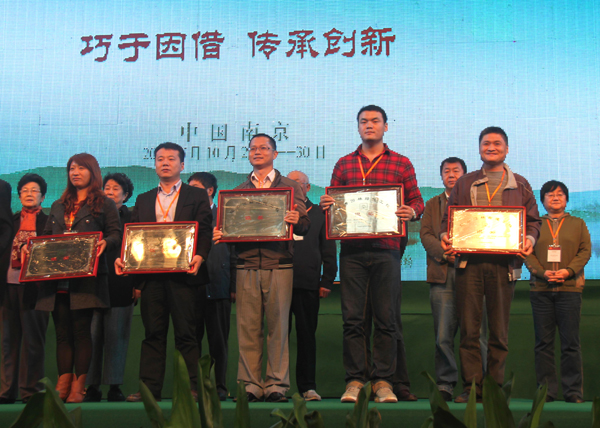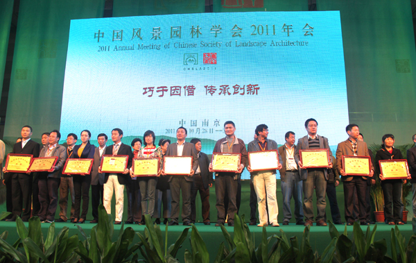 30日下午閉幕式的一個(gè)重要環(huán)節(jié)是為2011年度中國風(fēng)景園林學(xué)會(huì)優(yōu)秀園林工程獎(jiǎng)獲獎(jiǎng)單位頒獎(jiǎng)。由杭州市園林綠化工程有限公司承建的“昆明市市級(jí)黨政機(jī)關(guān)辦公用房搬遷建設(shè)項(xiàng)目區(qū)內(nèi)景觀綠化工程(第三標(biāo)段)”和“吳江市震澤鎮(zhèn)寶塔街西入口沿河、沿街北側(cè)、后花園仿古建筑工程”分別榮獲“中國風(fēng)景園林學(xué)會(huì)優(yōu)秀園林綠化工程獎(jiǎng)金獎(jiǎng)”和“中國風(fēng)景園林學(xué)會(huì)優(yōu)秀園林古建工程獎(jiǎng)銀獎(jiǎng)”。高總代表公司上臺(tái)領(lǐng)取了獎(jiǎng)牌。